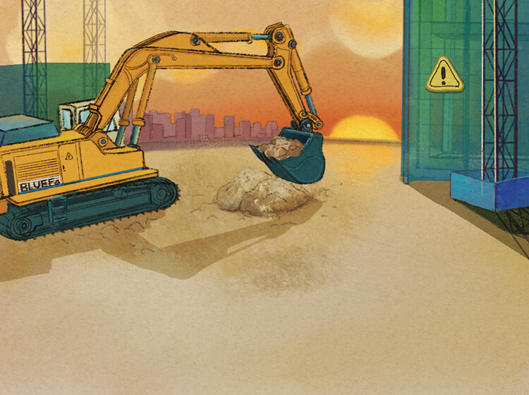 六一儿童节又到啦!夕阳闪yào在工地上,工人驾驶着挖掘机在挖土。我在挖掘机下欣赏城市的落日,聚精会神地讨论学习。鸟儿也在天边歌唱。